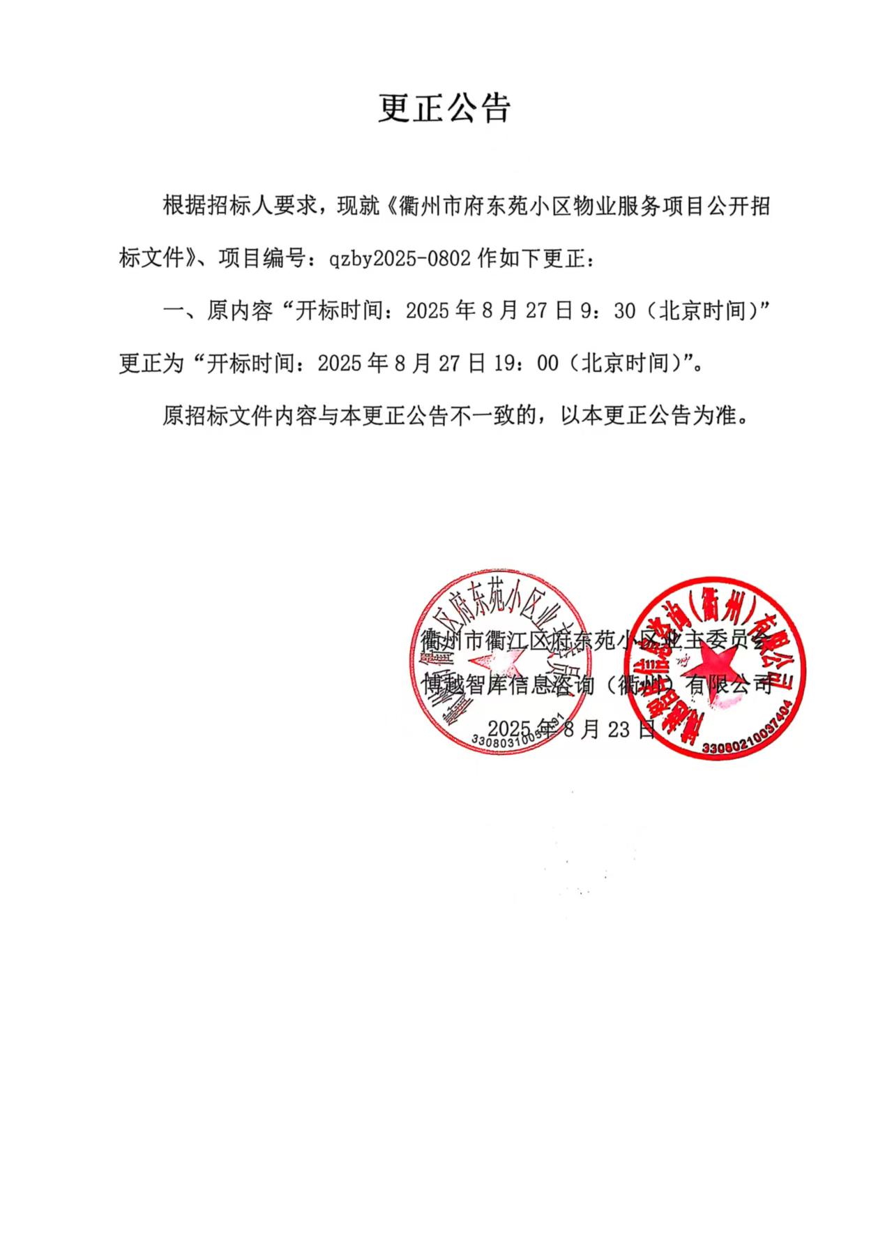 《衢州市府东苑小区物业服务项目公开招标文件》更正公告